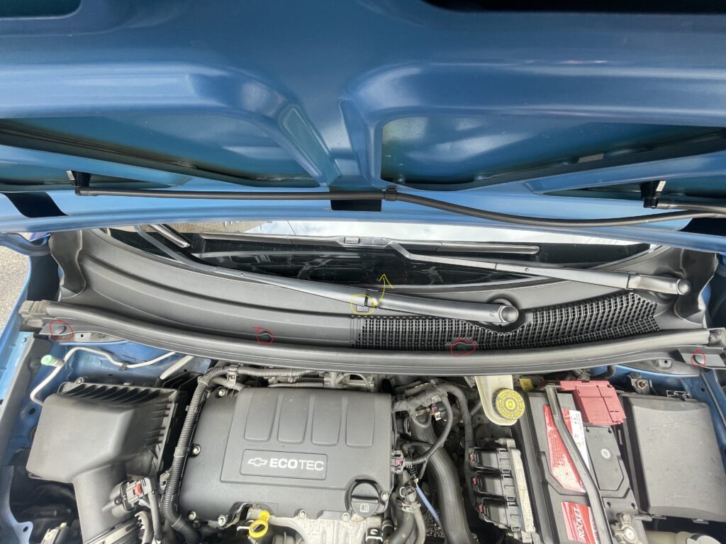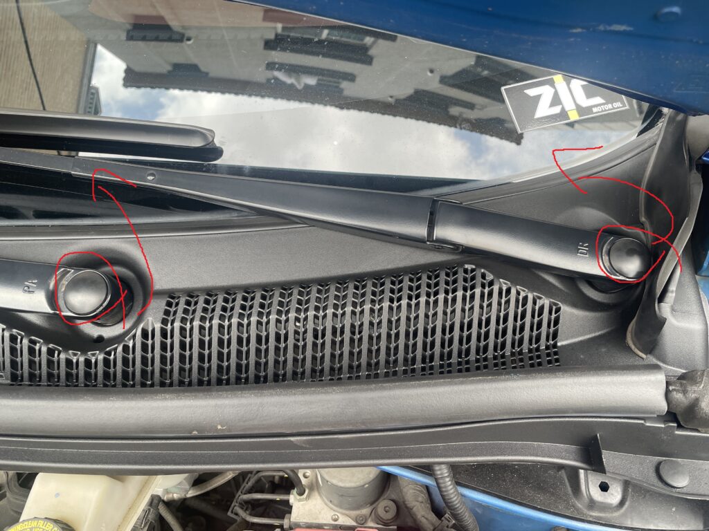 – 빨간색으로 표시 된 와이퍼 암 너트 커버를 일자드라이버나 송곳으로 제껴서 빼내기