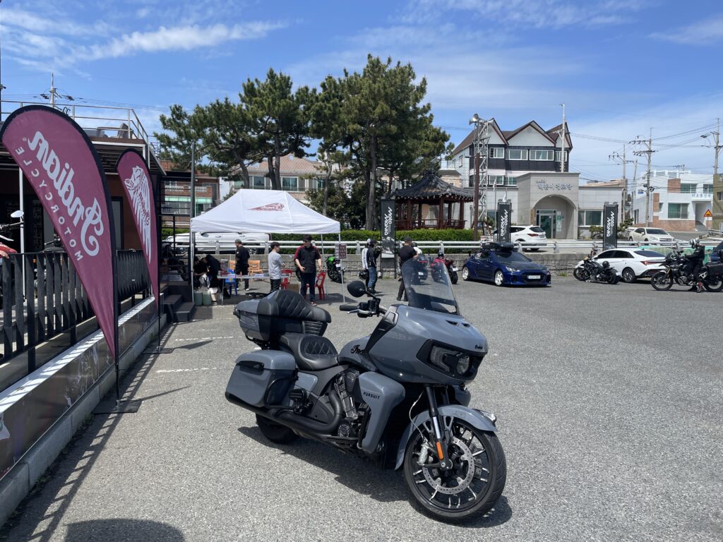 사실은 어제 해수욕장 방파제에서 낚시 한바리하구~~ 제일 가까운 카페인 모토매니아에 들러서 커피 한잔 때리고 있었거든요…. 그런데 눈에 띄는 입간판을 보니, 4/19 오늘자로~ 인디언 모터사이클 시승회가 열린다는 정보가 있어 묻지도 따지지도 않고 시승신청 갈겼어요 ㅋㅋㅋ